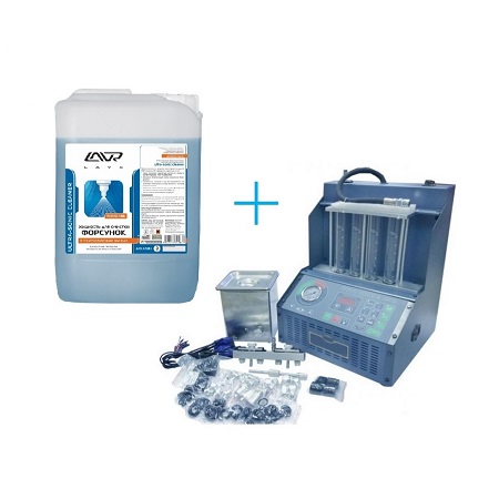 Стенд для промывки форсунок. Комплект предназначен для очистки топливной системы инжекторов без демонтажа форсунок. Данный набор также очищает и детали цилиндро-поршневой группы, из-за того, что принцип работы данного устройства основан на подаче чистящего вещества в цилиндры двигателя вместо обычного топлива. Для очистки используют специальную промывочную жидкость типа Лавр или Wynns.