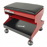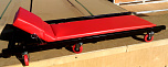 Лежак ремонтный на 6 колесах имеет металлическую основу, мягкий поролоновый матрац и поднимающийся подголовник.