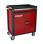 Тележка с одним ящиком и дверками для хранения ручного инструмента как в евроложементах, так и без них, мелкой оснастики и расходных материалов. Оборудована направляющими полного выдвижения. Запирается отдельным замком. Отсек с дверками используется для хранения инструмента в кейсах, переносных сварочных аппаратов, пневмоинструмента и т.п. Два колеса неповоротные, два колеса поворотные, одно из которых с тормозом. Размеры (высота x ширина x глубина): 850 х 700 х 460 мм. Вес: 34 кг.