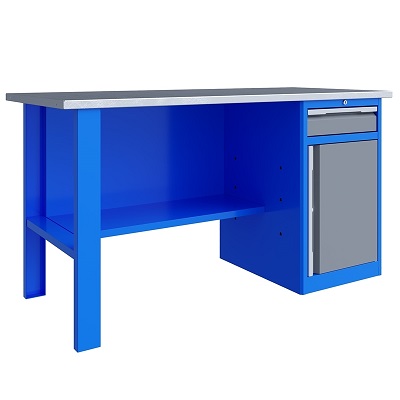 Верстак однотумбовый поставляется в разобранном виде. Нагрузка на столешницу до 600 кг. Стандартный цвет: корпус - серый глянец RAL 7030, ящики и двери тумб - синий RAL 5017. Размеры:855x1400x700 мм. Вес: 62 кг.