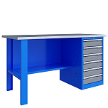 Однотумбовый. Допустимая нагрузка на столешницу 750 кг. Опорные элементы выполнены сварными из холоднокатаной стали. Верстак состоит из столешницы, опоры, тумбы P5 с четырьмя малыми и одним большим ящиком и полки-стенки. Все металлические элементы покрыты полиэфирной порошковой краской. Столешница состоит из фанеры марки ФСФ толщиной 24 мм, которая покрыта лаком-антисептиком и листом оцинкованной холоднокатаной стали толщиной 1,2 мм. Размеры (ВхШхГ) 855x1396x696 мм.