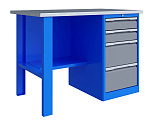 Верстак однотумбовый поставляется в разобранном виде. Нагрузка на столешницу до 600 кг. Стандартный цвет: корпус - серый глянец RAL 7030, ящики и двери тумб - синий RAL 5017. Размеры:855x1400x700 мм. Вес: 65 кг.