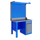 Однотумбовый. Допустимая нагрузка на столешницу 750 кг. Опорные элементы выполнены сварными из холоднокатаной стали. Верстак состоит из столешницы, опоры, тумбы P5 с четырьмя малыми и одним большим ящиком, полки-стенки, двойного экрана с кронштейнами и комплекта освещения. Все металлические элементы покрыты полиэфирной порошковой краской. Столешница из фанеры марки ФСФ толщиной 24 мм, которая покрыта лаком-антисептиком и листом оцинкованной холоднокатаной стали толщиной 1,2 мм. Размеры (ВхШхГ) 1965x1196x696 мм.