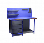 Однотумбовый. Допустимая нагрузка на столешницу 750 кг. Опорные элементы выполнены сварными из холоднокатаной стали. Верстак состоит из столешницы, опоры, тумбы P3 с тремя большими ящиками и полки-стенки. Все металлические элементы покрыты полиэфирной порошковой краской. Столешница состоит из фанеры марки ФСФ толщиной 24 мм, которая покрыта лаком-антисептиком и листом оцинкованной холоднокатаной стали толщиной 1,2 мм. Размеры (ВхШхГ) 855x1396x696 мм.