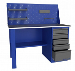 Однотумбовый. Допустимая нагрузка на столешницу 750 кг. Опорные элементы выполнены сварными из холоднокатаной стали. Верстак состоит из столешницы, опоры, тумбы P5 с четырьмя малыми и одним большим ящиком, полки-стенки и одинарного экрана с кронштейнами. Все металлические элементы покрыты полиэфирной порошковой краской. Столешница состоит из фанеры марки ФСФ толщиной 24 мм, которая покрыта лаком-антисептиком и листом оцинкованной холоднокатаной стали толщиной 1,2 мм. Размеры (ВхШхГ) 1470x1396x696 мм.