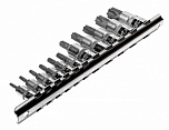 Головки изготовлены из закаленной хром-ванадиевой стали. Полированная поверхность. В набор входит планка крепления и хранения головок.Набор 9 предметов (Е10, Е11, Е12, Е14, Е14, Е16, Е18, Е20, Е22, Е24).
