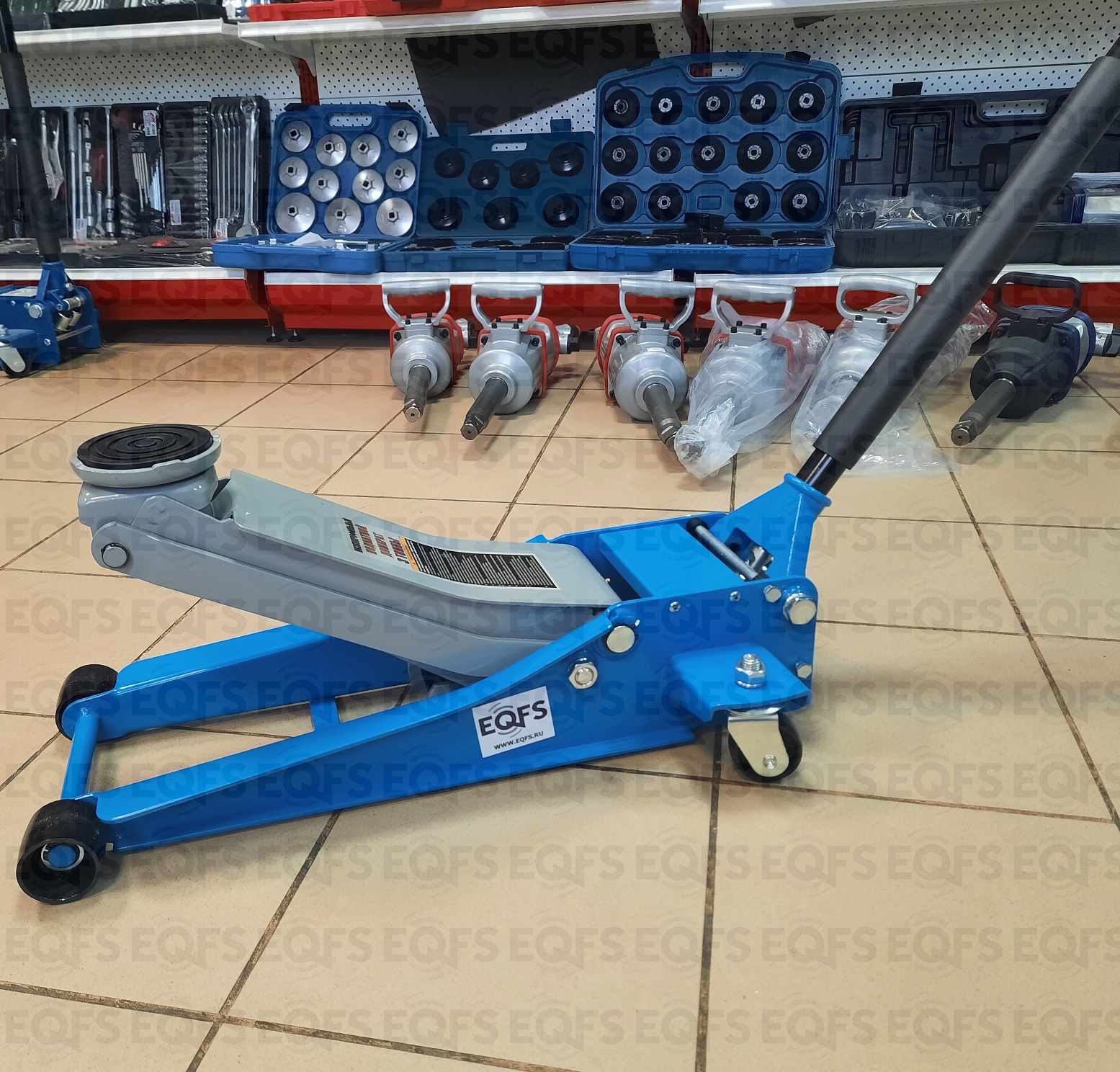 Домкрат подкатной low profile рекомендуется к применению в шиномонтажных мастерских и автосервисах для поднятия автомобилей с низким клиренсом. Цвет темно-синий.