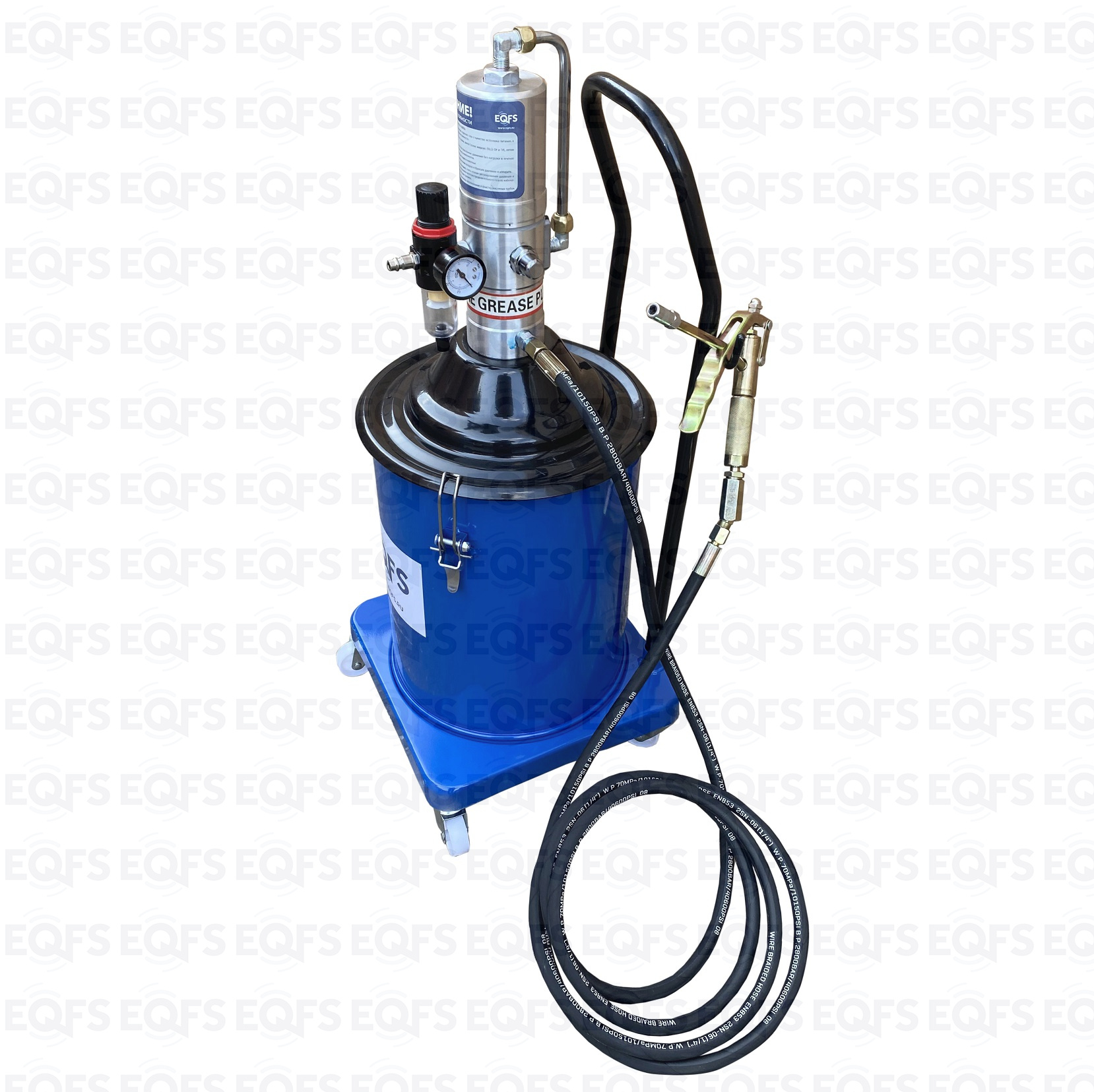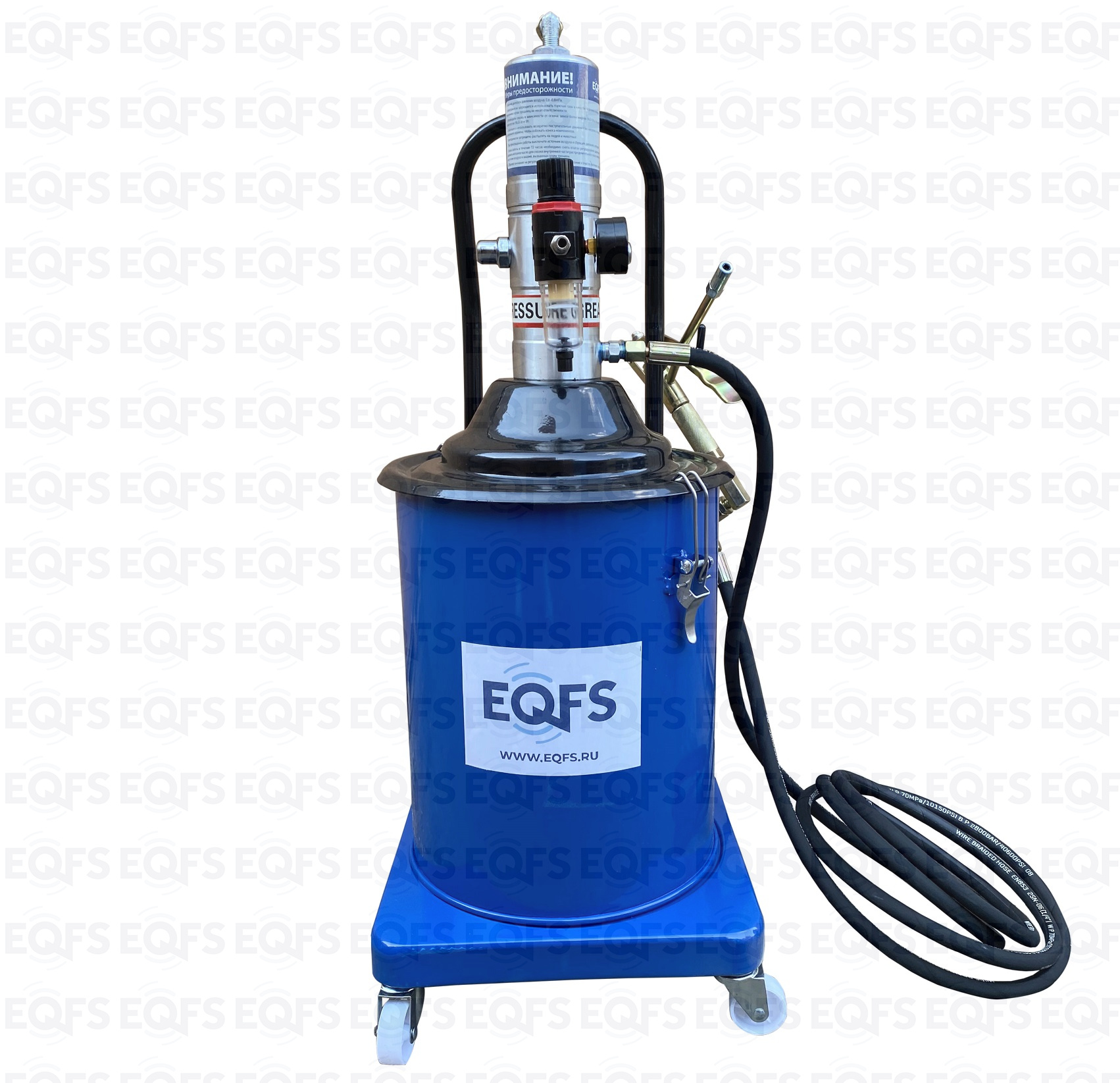 Корпус нагнетателя смазки – стальной, насос изготовлен из анодированной стали. Фиксация насоса с крышкой к баку для смазки производится с помощью металлических защелок с резьбой. Для удобства транспортировки нагнетатель оборудован металлической ручкой в верхней части корпуса. Нагнетатель оборудован маслобензостойким армированным шлангом длиной 4 м. Солидолонагнетатель для консистентной смазки, установленный на колесах, имеет легкий вес и экономичную конструкцию для удобства перемещения и эксплуатации.