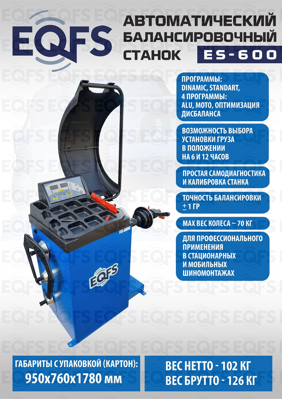 ES-600 Балансировочный станок. Автомат. Удобный и понятный интерфейс. Лазерная указка места крепления груза. Режим автокалибровки. Режим самодиагностики. Для балансировки колёс легковых автомобилей, мотоциклов и лёгких грузовиков с диаметром диска с резиной до 800 мм. Размеры диска: ширина 3–10” (76-254 мм) , диаметр диска 10–24” (254÷609 мм). Прочный вал  Ø - 40мм. Гарантия 18 мес – наш монтаж, 12 мес – самостоятельная установка.