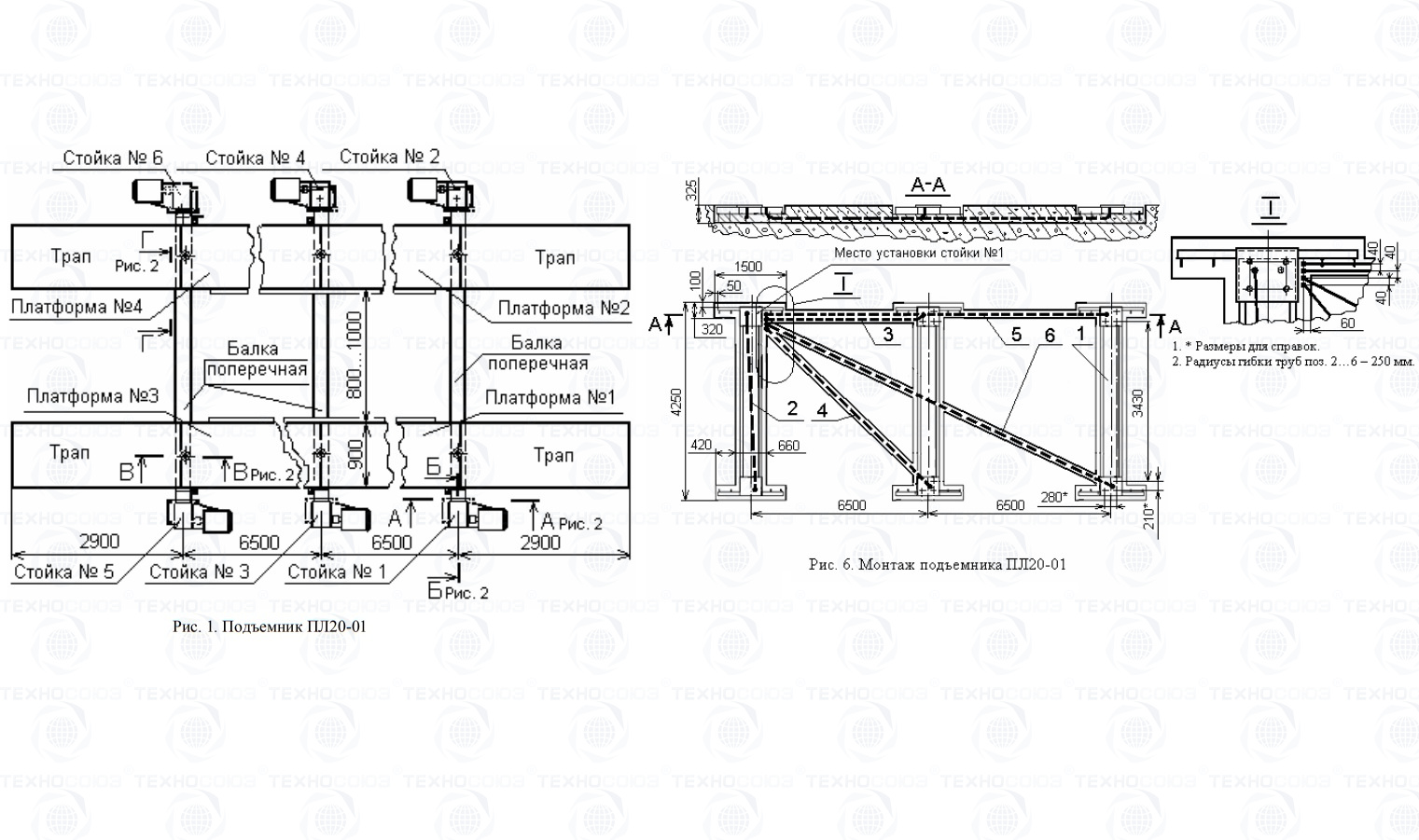 Подъемник состоит из шести стоек 1, 2, 3, 4, 5, 6 (см. Рис.), каждая из которых имеет электромеханический привод, состоящий из электродвигателя и червячного редуктора, грузовой винт, рабочую и страхующую гайки, конечные выключатели верхнего и нижнего положений балок. Стойки попарно соединены поперечными балками лежащими на опорных шайбах рабочих гаек. На поперечных балках установлены платформы фиксируемые в зависимости от колеи автомобиля. На стойке 1 установлен шкаф аппаратный, с панелью электрооборудования, лампочками «Сеть» и «Аварийное отключение», кнопками управления «Вверх» и «Вниз» и с автоматическим выключателем. Стойки подъемника крепятся на раме, состоящей из трех оснований. Рама в зависимости от пожелания заказчика может быть забетонирована в пол, либо установлена на поверхности пола с возвышением над уровнем пола на 74 мм.