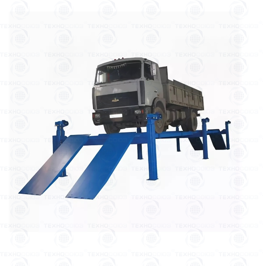 г/п. 20 тонн. Шестистоечный. Электромеханический. Для ремонта грузовых автомобилей и автобусов на любой ровной площадке. Привод червячный редуктор, с концевыми выключателями нажимного действия, ограничивающими ход каретки. Рабочие гайки повышенной прочности и износостойкости. Многоуровневая система безопасности. По отдельному заказу комплектуется установочными рамами. Поставляется в 2 вариантах Стандарт (в помещение) и ТЗ (Для эксплуатации на улице).
